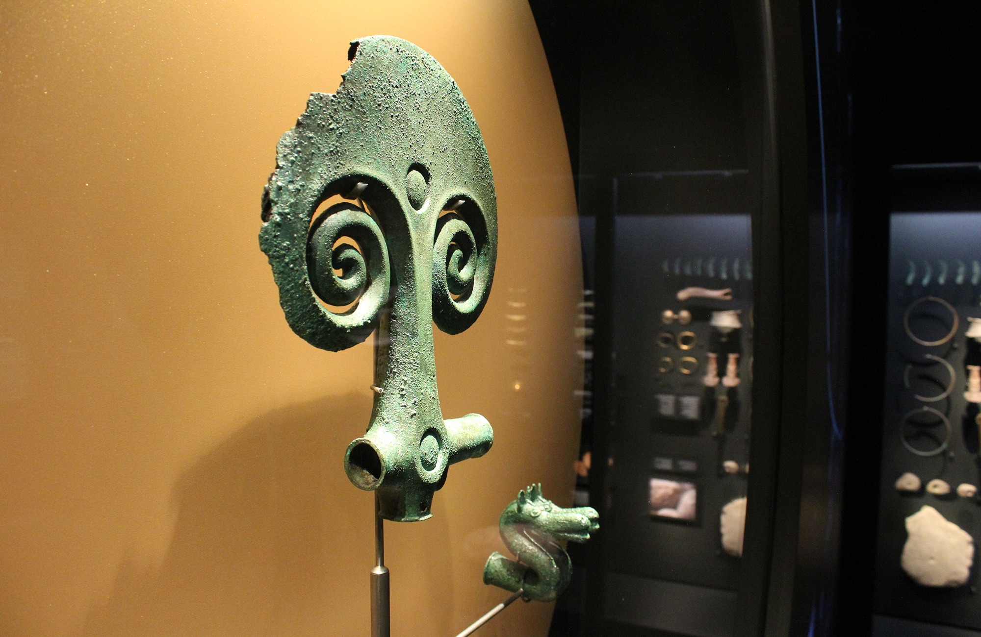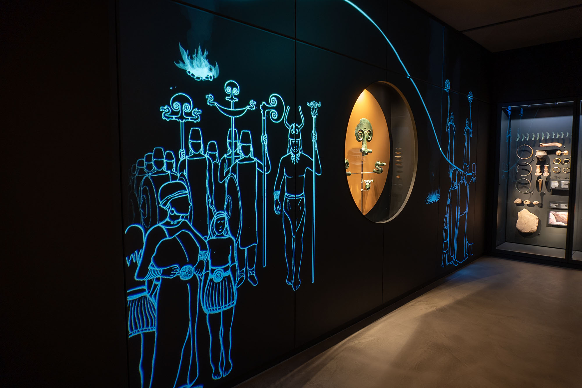 Centralt i udstillingen finder du det unikke Kallerupfundet, der består af en stor ceremoniøkse, en dobbeltansigtet, hornet figur og to dobbelte hestefigurer – alle støbt i bronze. Du finder også udvalgte eksemplarer af guldbådene fra Nors, der er hundrede små bådefigurer af tyndt guld. Nogle med spanter af bronze og nogle udsmykket med soltegn.